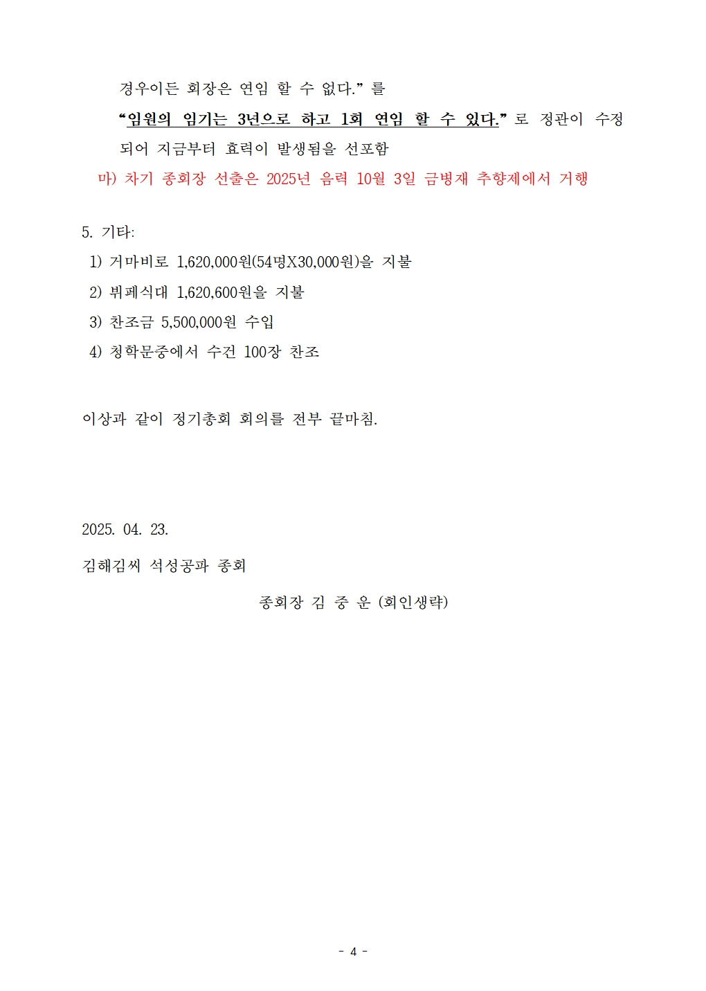 *종회장 이취임식은 정기총회에서 거행하는 것이 원칙이지만 금병재 시향제에서 거행하게된 관련근거를 아래 회의록에 첨부하였습니다.